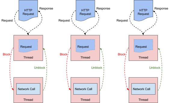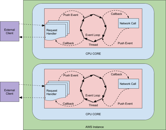 - One thread per CPU core handling all requests and responses. The lifecycle of the request and response is handled through events and callbacks.