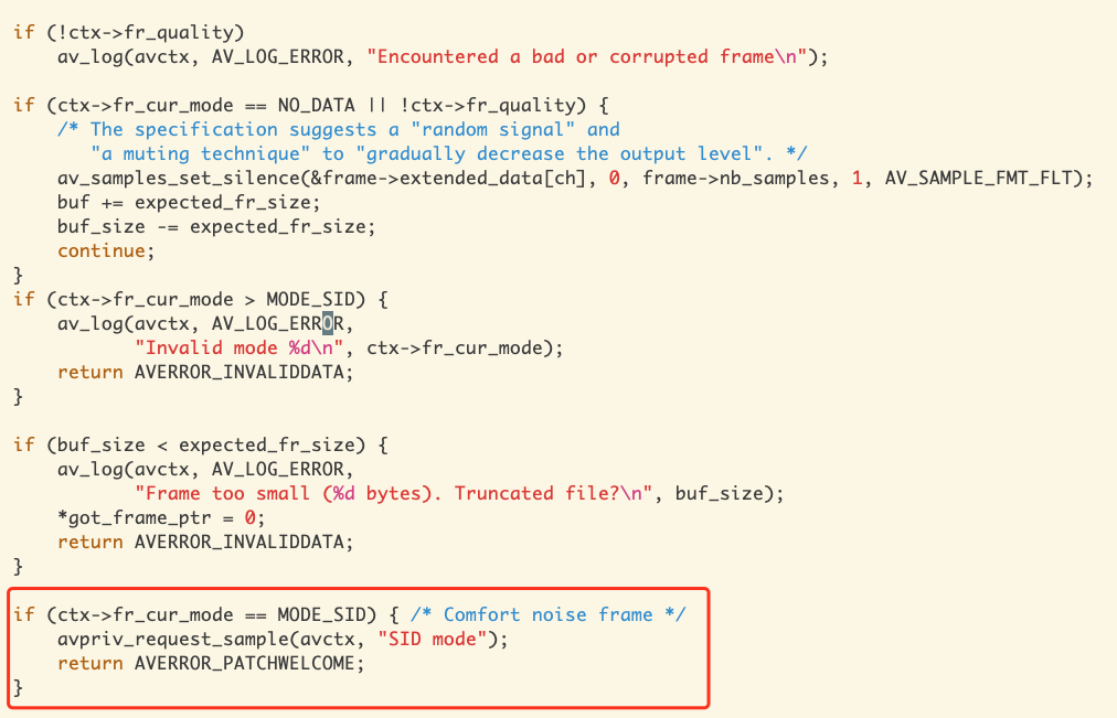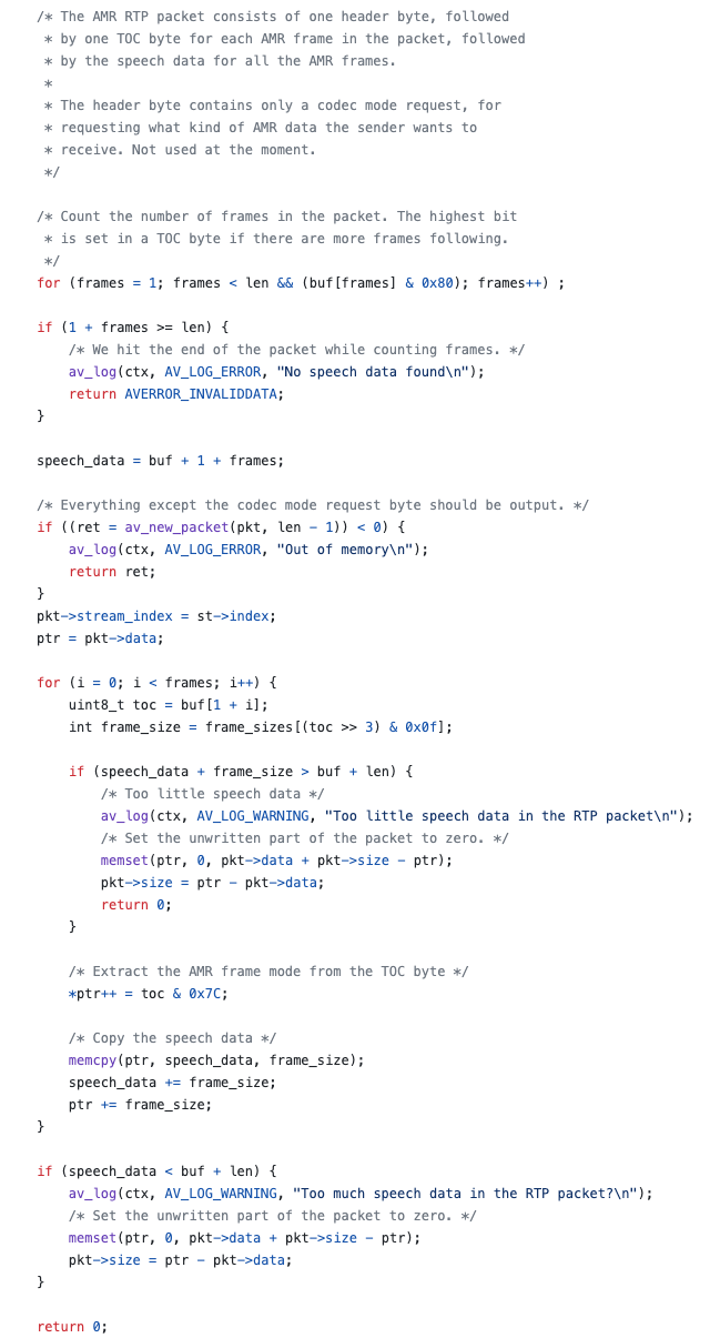 终端所采用的AMR-WB并非常见的Octet-aligned,而是Bandwidth-efficient。不幸,FFmpeg并不支持这种模式的编码:rtpdec_amr.c