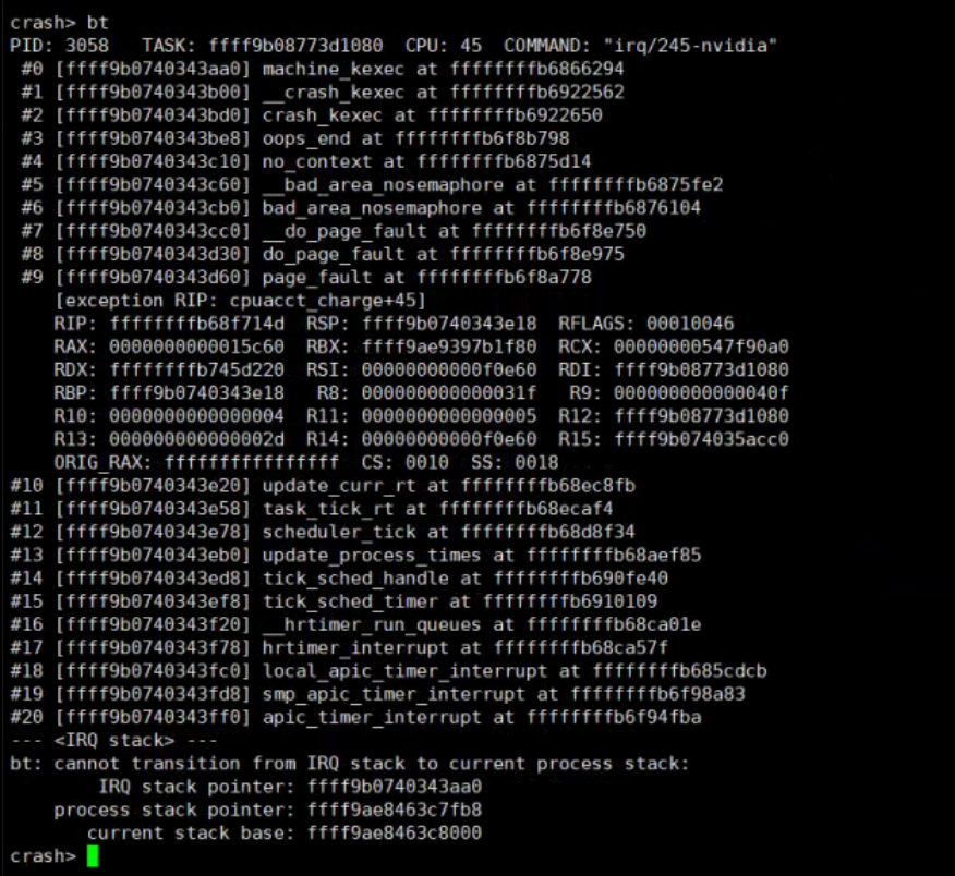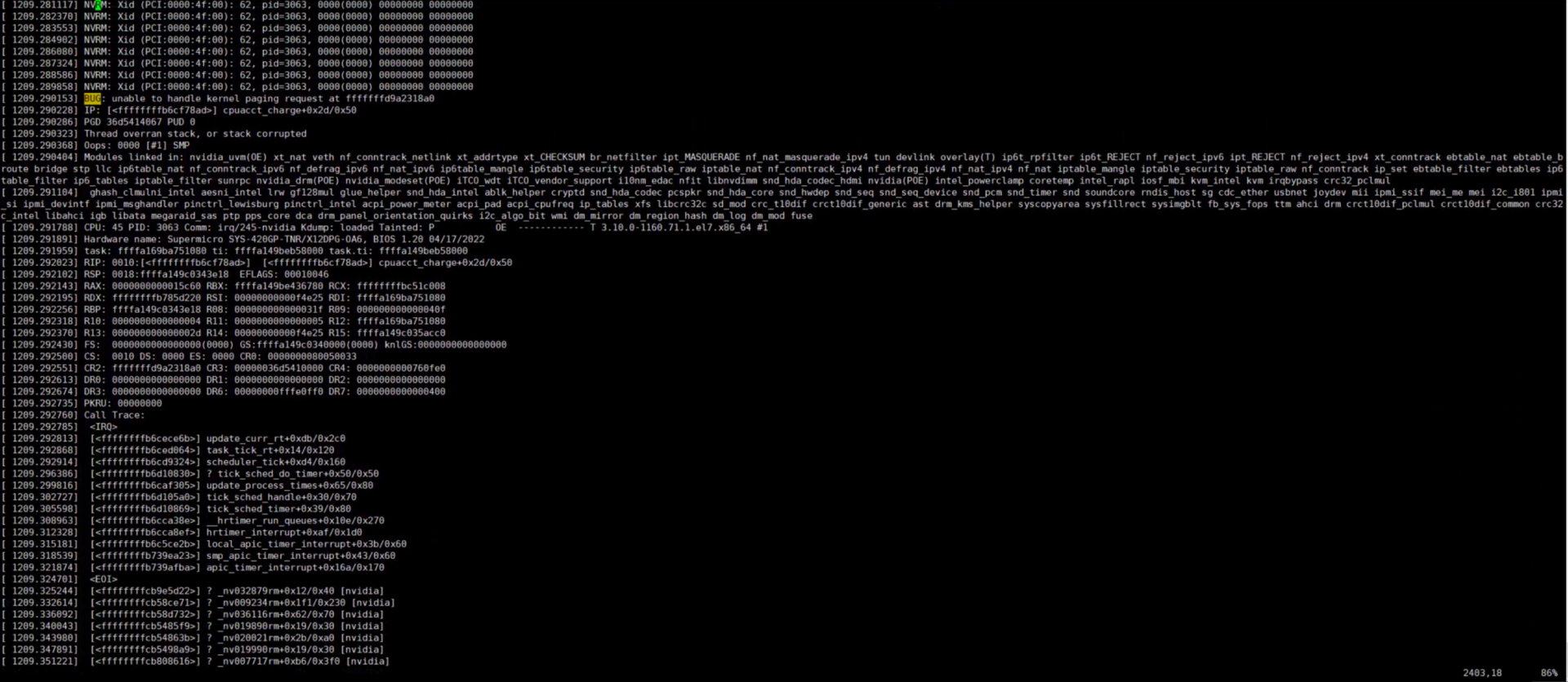 查看 /var/crash/ 下的log,发现BUG: unable to handle kernel paging request at xxxxxxx