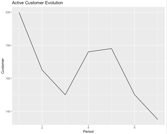 ggplot(CLV.df, aes(x = t, y = r)) + geom_line() + ylab("Customer") + xlab("Period") +
