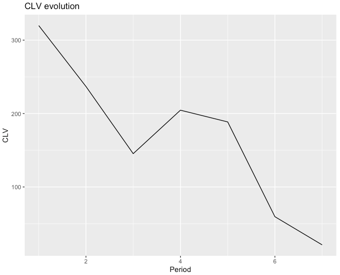 ggplot(CLV.df, aes(x = t, y = CLV)) + geom_line() + ggtitle("CLV evolution") + ylab("CLV") + xlab("Period")