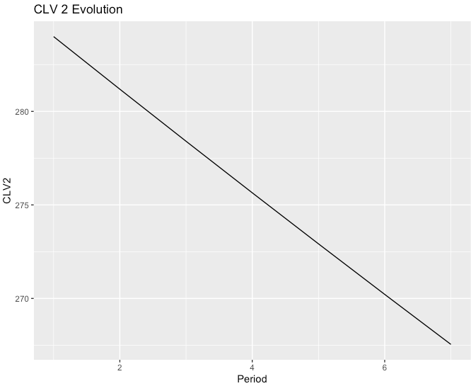 ggplot(CLV.df, aes(x = t, y = CLV2)) + geom_line() + ylab("CLV2") + xlab("Period") + labs(title = "CLV 2 Evolution")