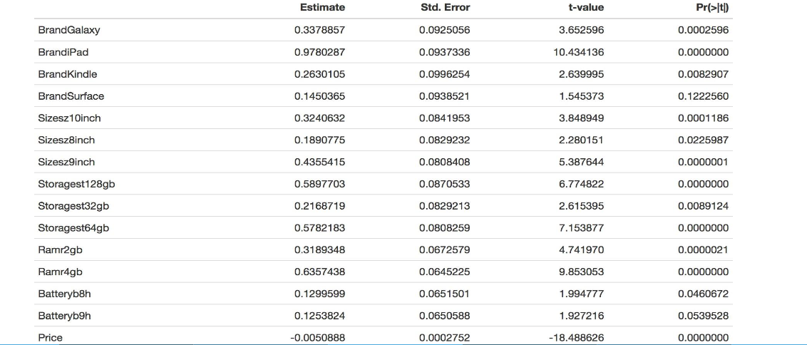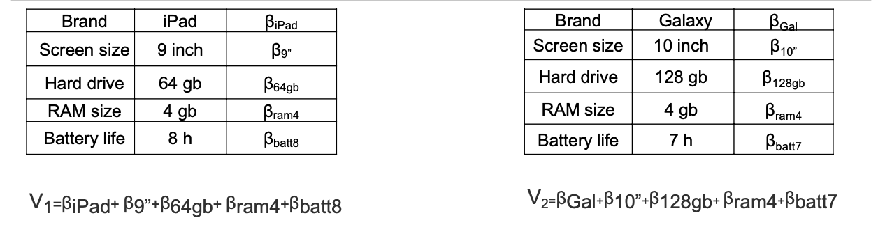 $$ V_j = β_{iPad} \times iPad_j + β_{Gal} \times Gal_j + β_{Kind} \times Kind_j + β_{Surf} \times Surf_j