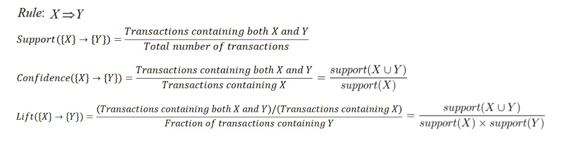 • Lift: Ratio of confidence to baseline probability of occurrence of {Y}