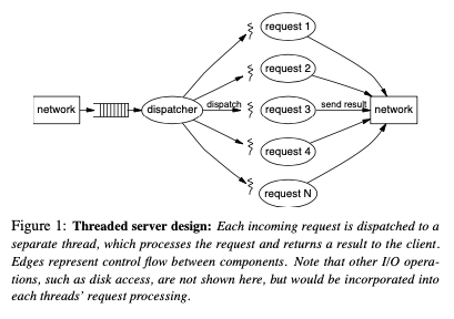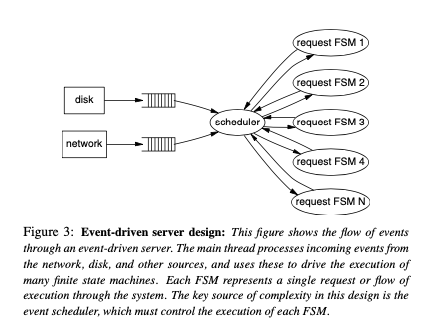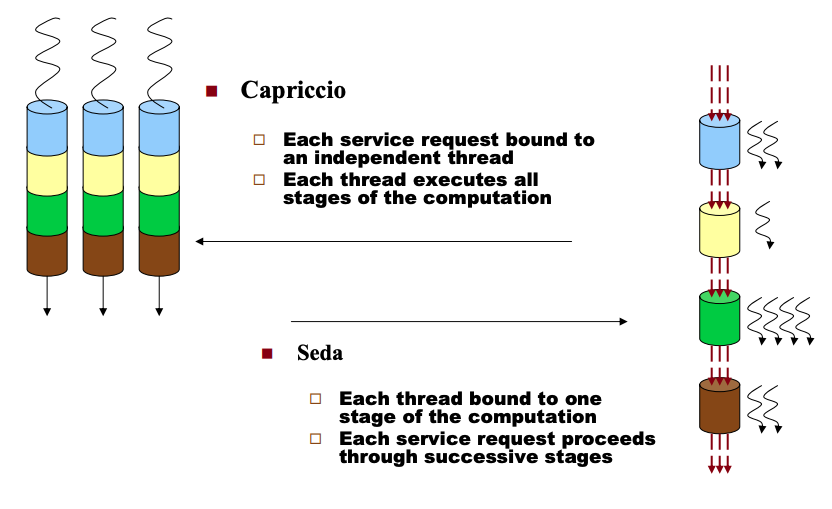 针对事件驱动,人们提出改进方案(感觉可以理解为去中心化)。使用一组事件队列以完成模块化,简化设计。 例如:解耦两个组件的执行,从而提高了模块化和鲁棒性。聚合多个类似事件的执行,增强局部性,从而提高性能。