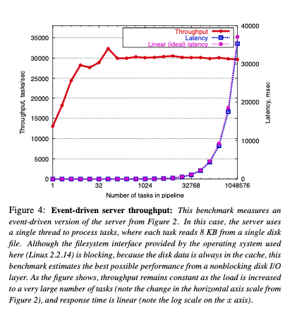 事件驱动在负载方面健壮,当负载逐渐逼近并超过最大负载量的时候,吞吐量几乎不会下降,并且后续请求会堆积在队列中,延迟线性增加。