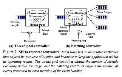 - 线程池数量控制器。保证有足够的线程处理Stage,防止过多或者过少分配。周期性采样输入队列,当队列长度超过某个阈值的时候添加线程;当线程空闲时间超过阈值的时候,去掉线程。