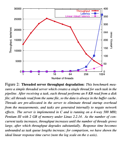 特点是编程容易,每个请求一个线程彼此独立处理。但是和线程相关的开销在线程数量很大的时候可能会造成性能的严重下降,例如缓存或者TLB的未命中、调度开销或者锁的竞争。而且,现在的操作系统(或者这里可以指代为编程语言)在努力以一种对应用程序透明的方式,虚拟化硬件资源。在这种背景下,应用程序很少有机会能够参与系统范围内的资源管理、决策,或者了解到当前系统的资源可用情况,来适应、调整自己的调度分配。操作系统资源的虚拟化,实际上是隐藏了资源有限和资源共享的事实。